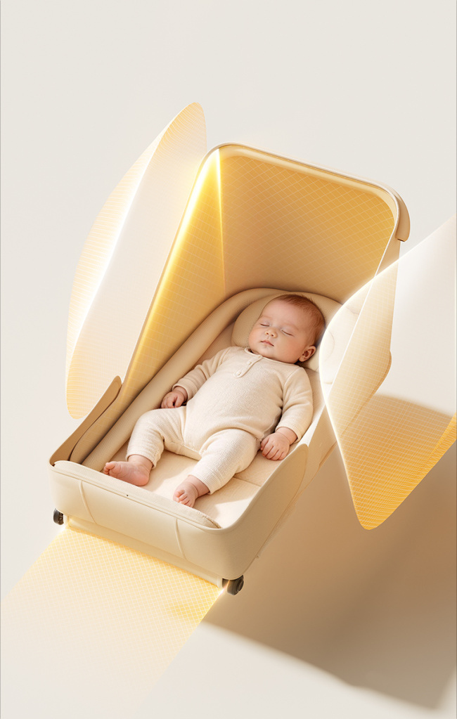 **摇篮方舱守护系统**:无需额外拆卸,切换睡篮+座兜模式,硬靠背设计减少65%颈椎压力,覆盖0-3岁全阶段;