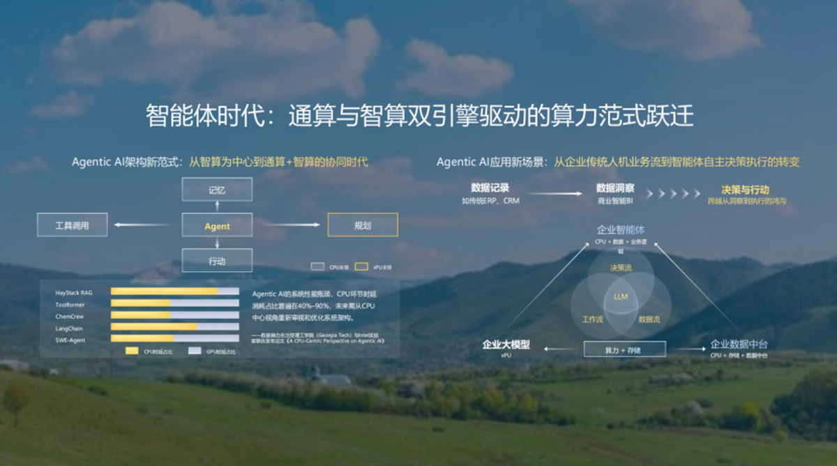 过去行业普遍聚焦GPU算力投入,将智算作为AI发展的重要支撑,但随着智能体技术的落地应用,算力架构迎来根本性转变。从智能体架构本身来看,其规划、记忆、工具、行动四大模块中,除规划模块外,其余三个模块均主要依赖CPU运行。研究数据显示,在主流AI应用的工作流中,CPU处理的环节耗时占比高达40%甚至90%。这意味着,脱离高性能、高适配的通用算力支撑,再强大的智算能力也无法发挥完整价值,通算(CPU)与智算(GPU)双引擎协同,成为智能体时代的必然选择。