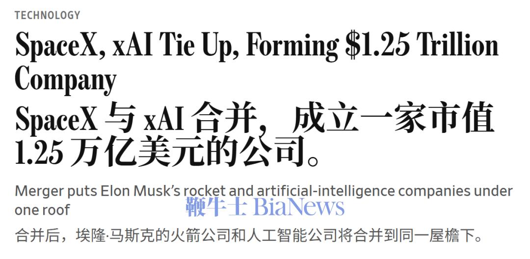 2026年2月2日,SpaceX以全股票交易的方式收购了xAI,SpaceX估值1万亿美元,xAI估值2500亿美元,合并后实体价值1.25万亿美元,创下有史以来最大企业并购估值纪录。