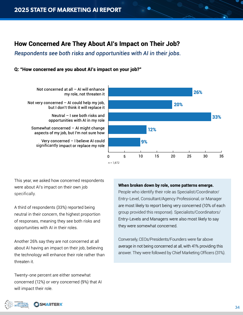 情绪层面呈现出“乐观与焦虑并存”的分化。70%的受访者对AI总体持积极态度,但53%认为未来三年AI将净减少营销岗位,较2023年上升13个百分点。与此同时,仅21%对自身岗位表示明确担忧,多数人处于观望状态。这表明个体对AI的认知尚未完全内化为职业风险判断。