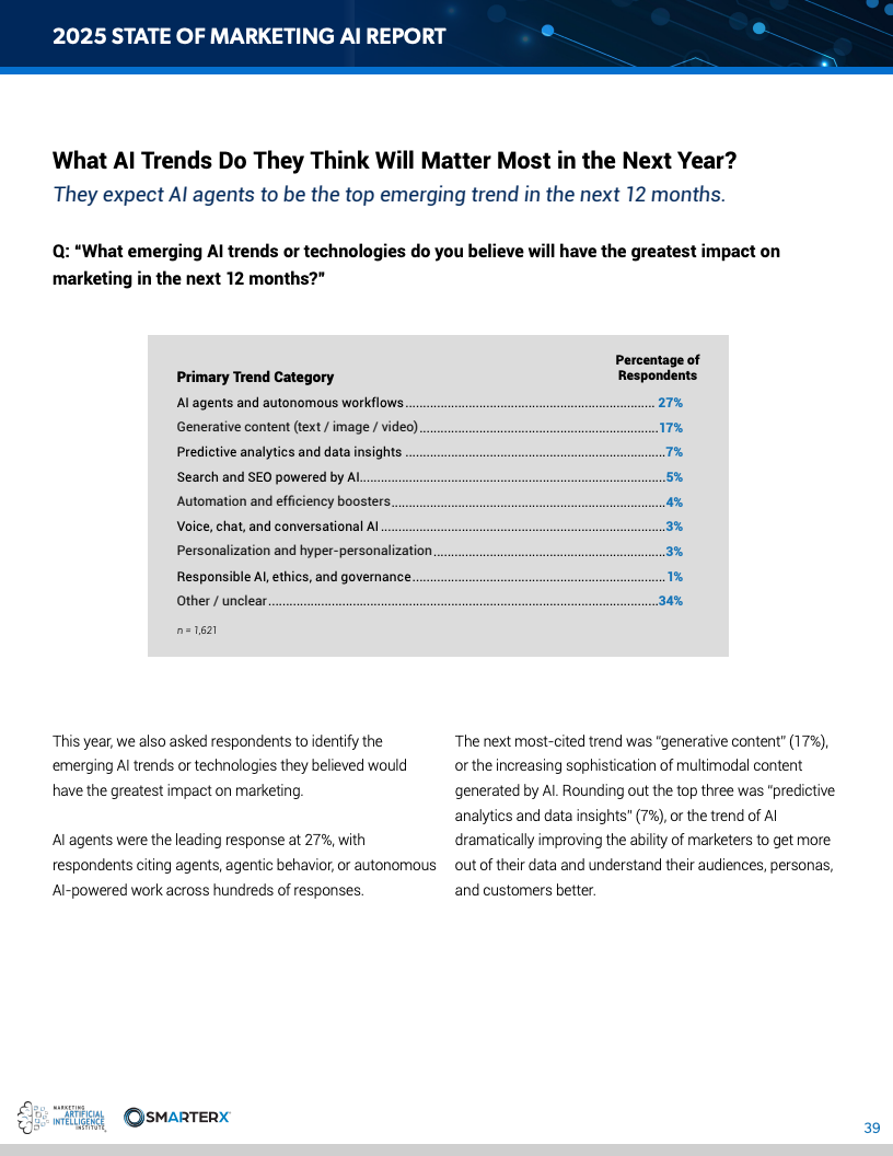 从趋势判断看,AI代理被27%的受访者视为未来一年最重要技术方向,其次是生成式内容(17%)与预测分析(7%)。结合当前82%企业以效率为导向的应用目标,可以预见,下一阶段AI将从“辅助工具”升级为“自主执行系统”,进一步重构营销流程。