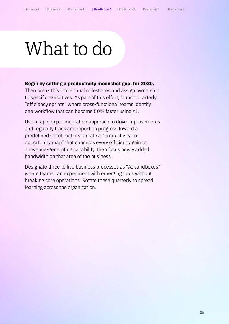 从资源配置看,企业正在重新定义投资重心。2025年至2030年间,AI投资预计增长约150%。当前47%的AI支出仍集中于效率提升,但到2030年,约62%的投入将转向产品、服务及商业模式创新。这一变化反映出高管共识正在形成:效率不再是终点,而是为创新持续“供能”的起点。生产率提升正在被视为长期竞争力的融资工具,而非一次性成本红利。