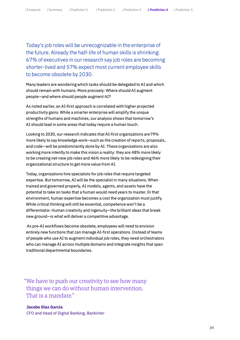 组织层面的人力结构同样在被重塑。67%的高管认为岗位生命周期正在缩短,57%预计当前员工技能将在2030年前过时。与此同时,近三分之二的高管预计到2030年,代理式AI将深度嵌入财务、销售、市场、IT与研发等核心职能。人的价值正从“执行任务”转向“定义问题、判断结果与提供创造力”,组织对再培训和新型角色的需求将显著上升。