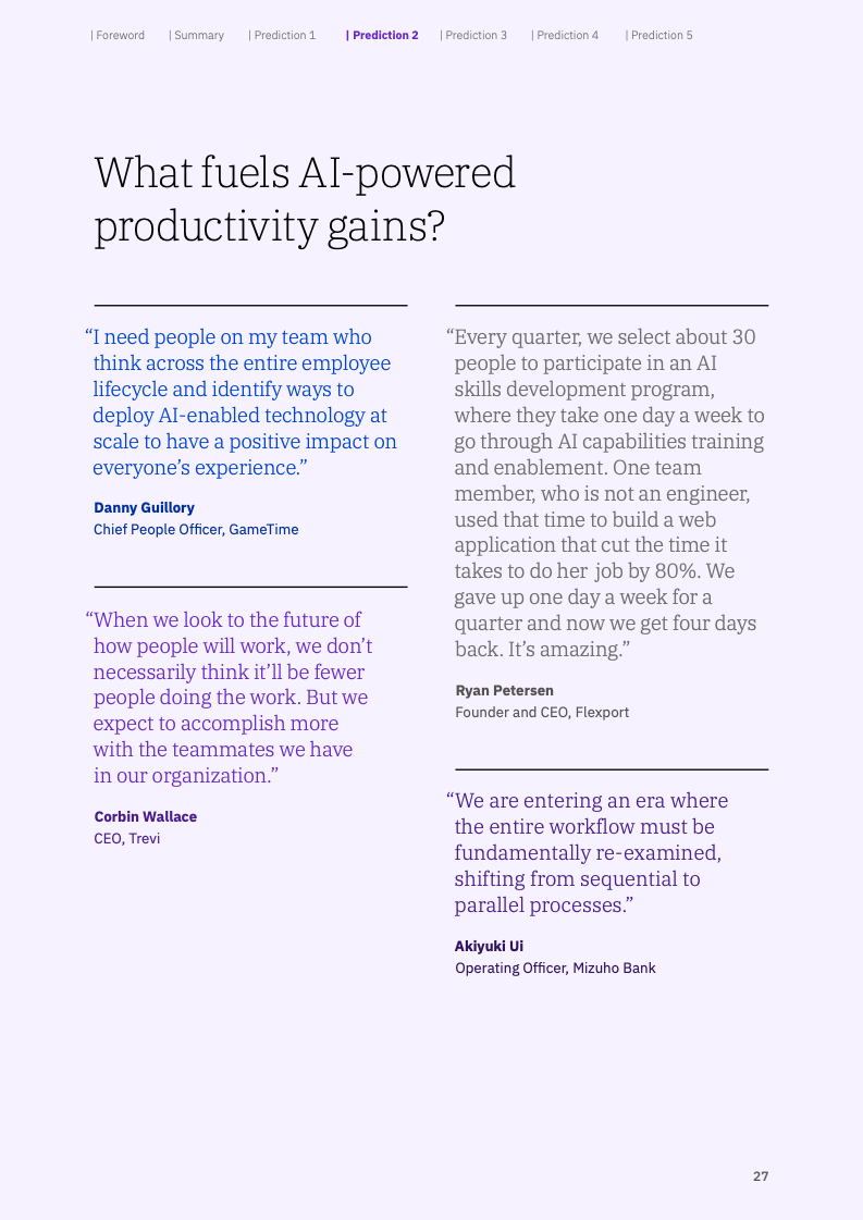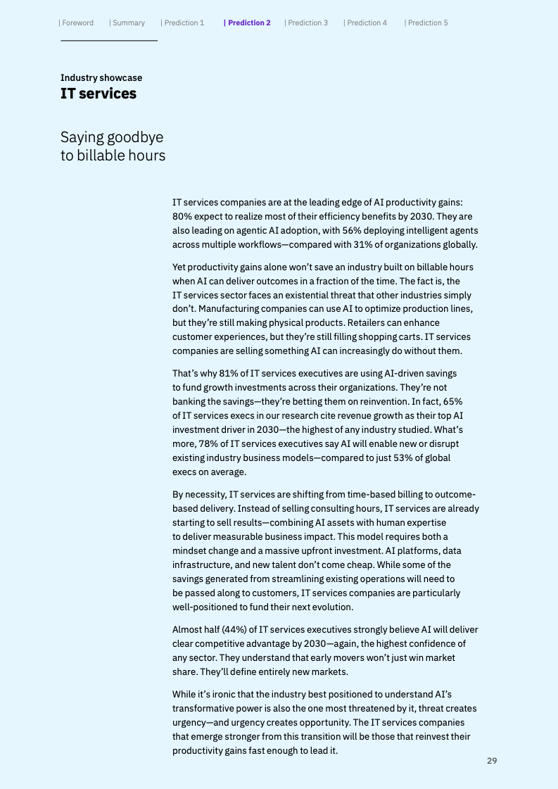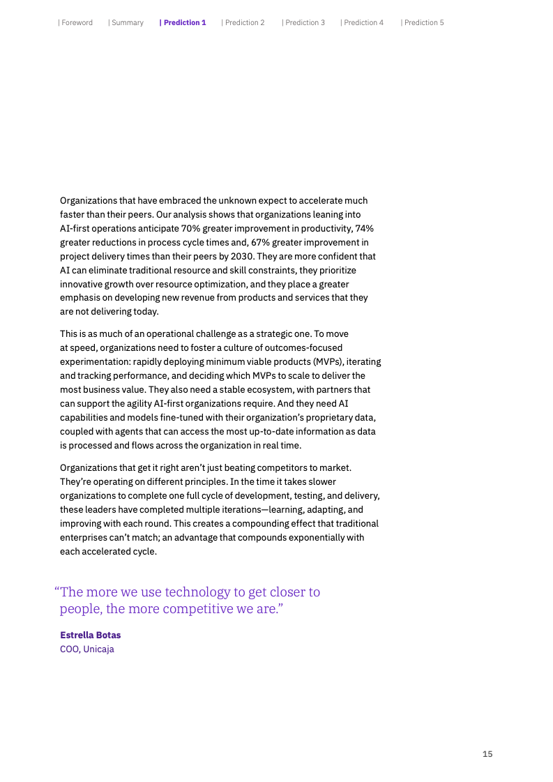 调研进一步显示,AI优先型企业在关键经营指标上形成明显分化。相比同业,这类企业预计到2030年生产率提升幅度高出70%,流程周期缩短幅度高出74%,项目交付效率提升高出67%。同时,55%的高管认为未来竞争优势更多取决于执行速度而非“完美决策”,表明在高度不确定环境中,快速试错和实时纠偏将取代长期规划成为主导能力。
