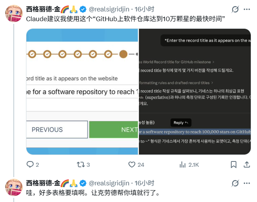 戏剧性的是,Claw-Code开发者本人随后发文,打算凭此申请吉尼斯世界纪录,甚至请Claude来给他建议,可谓是一波“骑脸输出”。随后,Claude建议他以“GitHub上达成10万颗星的最快时间”的名义申请。