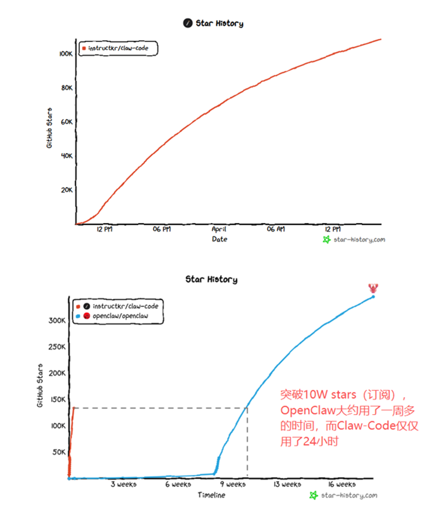要知道,即使是2个月前全球火爆、近期热度仍不减的“龙虾”OpenClaw,star量突破10万也用了一周多的时间,可见Claw-Code,或者说严格意义上的Claude代码,在开发者群体中的研究价值有多高。