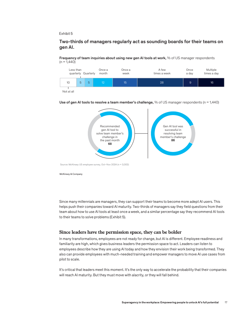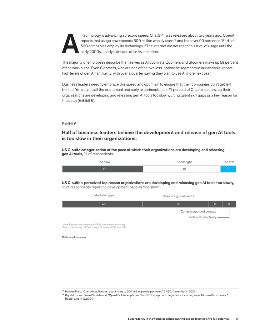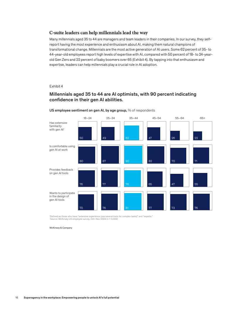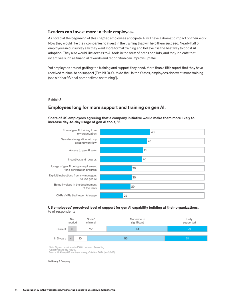 员工层面则显示出高度的AI适应性和期待。调研中,员工使用Gen AI完成日常工作任务的量是领导者预计的三倍以上;超过70%的员工相信未来两年其工作中有30%以上将被AI影响。然而,近半数员工反映培训支持不足,只有部分企业满足了员工对AI技能提升的需求。特别是处于管理岗位的千禧一代,他们熟悉AI且被视为推动AI应用的关键中坚力量。领导层若能重视并充分利用员工的渴望与潜力,推动AI培训和工具普及,将极大促进AI的落地应用。