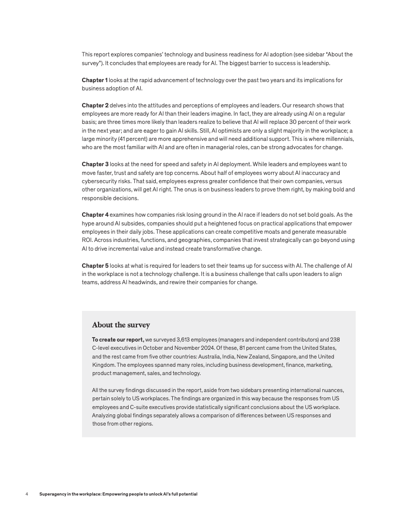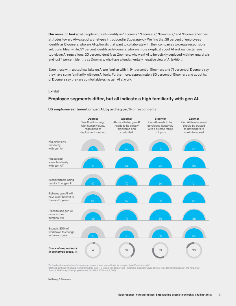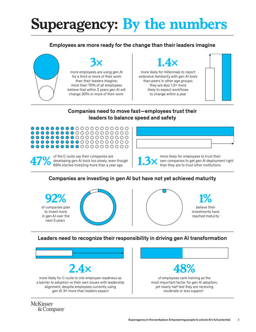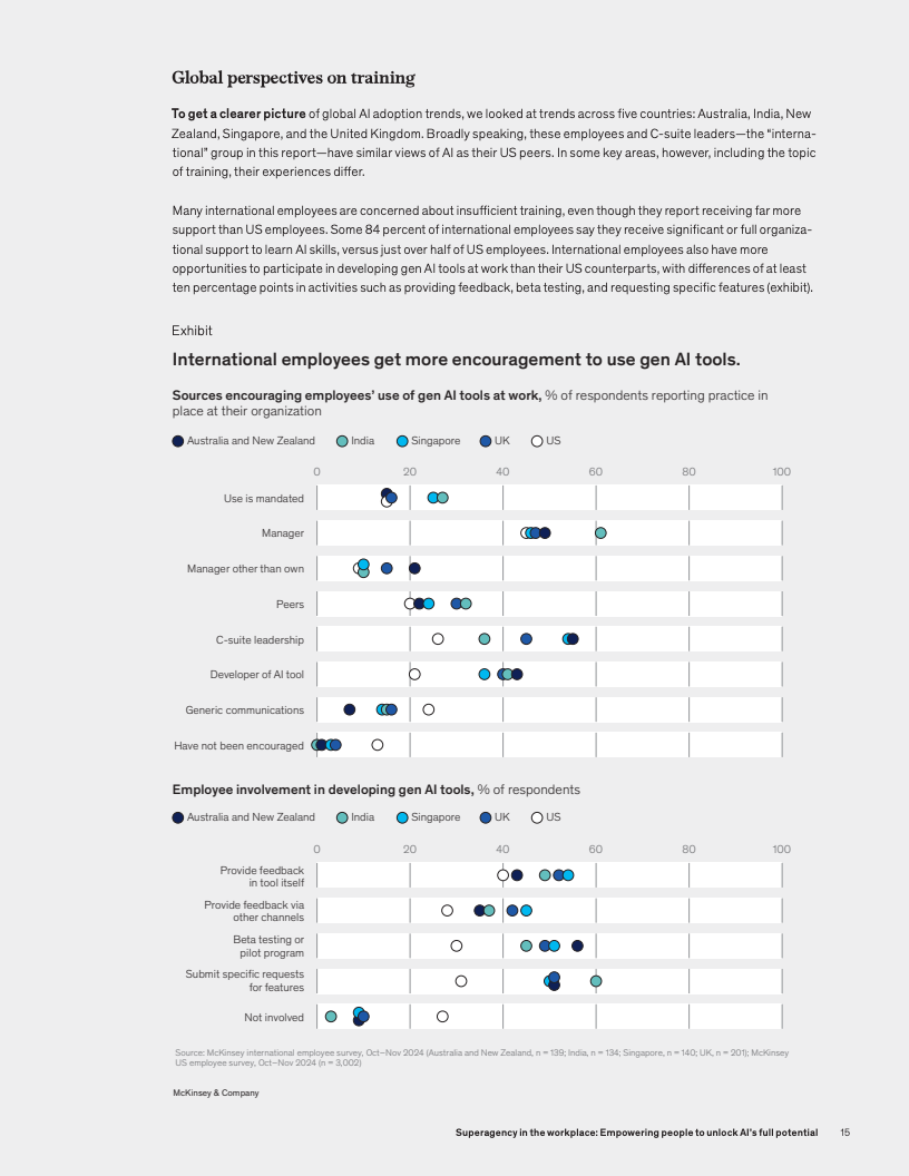 员工层面则显示出高度的AI适应性和期待。调研中,员工使用Gen AI完成日常工作任务的量是领导者预计的三倍以上;超过70%的员工相信未来两年其工作中有30%以上将被AI影响。然而,近半数员工反映培训支持不足,只有部分企业满足了员工对AI技能提升的需求。特别是处于管理岗位的千禧一代,他们熟悉AI且被视为推动AI应用的关键中坚力量。领导层若能重视并充分利用员工的渴望与潜力,推动AI培训和工具普及,将极大促进AI的落地应用。
