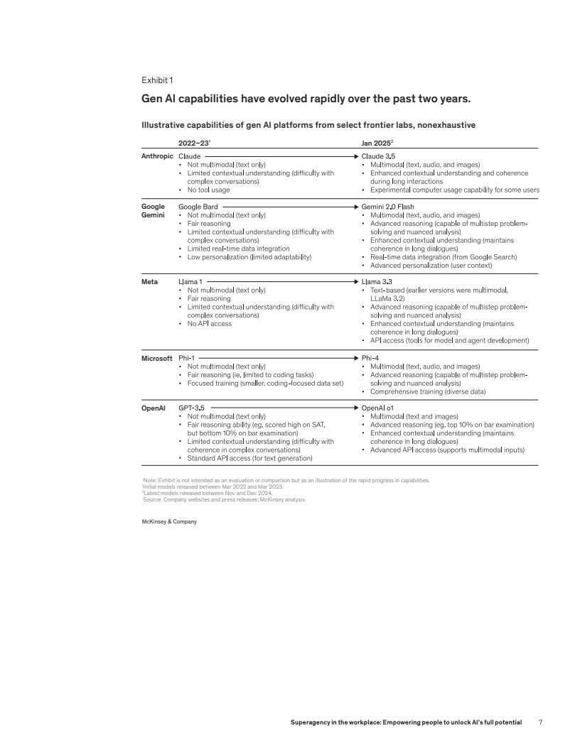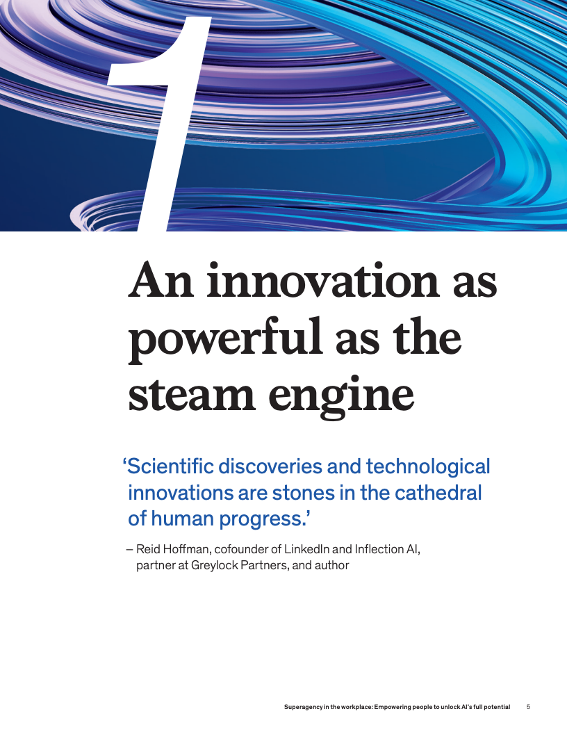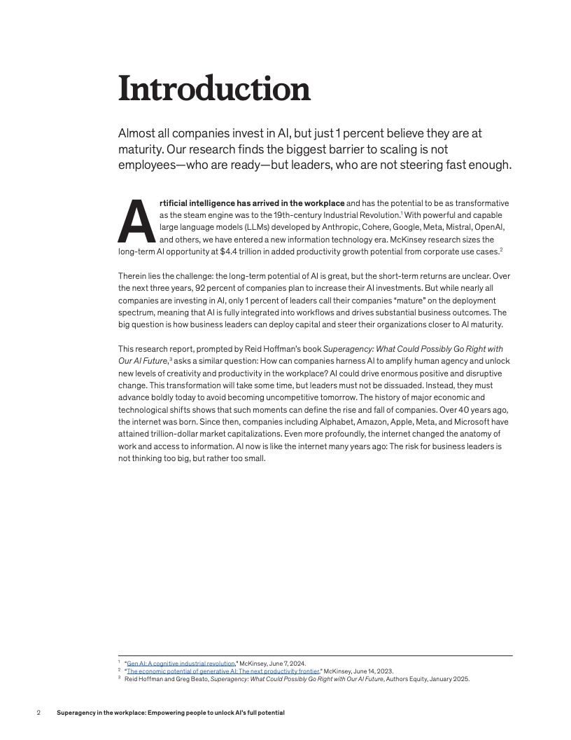 人工智能正在职场引发一场堪比19世纪工业革命蒸汽机的深刻变革。以OpenAI、Google和Anthropic等领先企业推动的大型语言模型为代表的新一代生成式人工智能(Gen AI),正开启信息技术的新时代。据麦肯锡研究,企业应用AI的潜在长期生产力提升可达4.4万亿美元,显示了其巨大经济价值。然而,现实情况是,尽管92%的公司计划未来三年增加AI投资,只有1%的企业领导者认为他们的AI应用已达到成熟阶段,表明AI与业务深度融合及产出转化仍处于早期。因此,企业领导层如何有效部署资本、促进组织AI成熟,是当前亟需解决的核心问题。