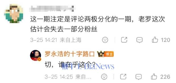 永浩的评论区提醒老罗:“这一期注定是评论区两极分化的一期,老罗这次估计会失去一部分粉丝。”罗永浩则表示