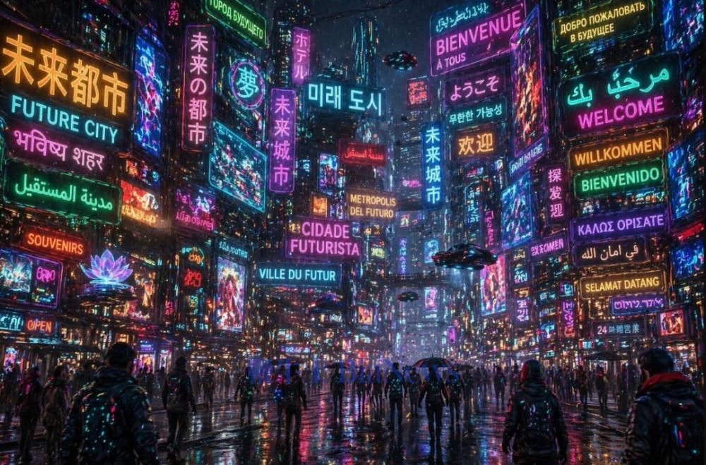 一个拥有各种语言电子广告牌的赛博朋克世界。
