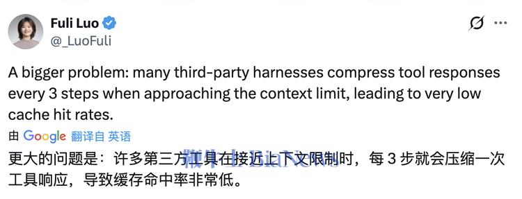 第二个层面是缓存效率。她在评论区补充道:"更大的问题是,很多第三方 harness 在接近上下文长度限制时,每隔几步就压缩一次工具返回结果,导致 cache 命中率极低。"