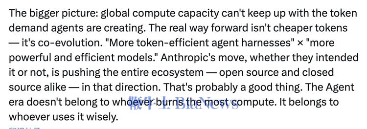 她写道:"全球算力的供给速度,已经追不上 Agent 场景下 token 消耗的增速。真正的出路不是更便宜的 token,而是协同进化,更高 token 效率的 agent harness,乘以更强大、更高效的模型。Anthropic 这次,不管主观意图是什么,客观上把整个生态,无论开源还是闭源,都推向了这个方向。Agent 时代不属于烧算力最多的人,而属于用算力最聪明的人。"