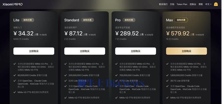 MiMo 的 Token Plan 走的是另一条路。MiMo 没有封掉第三方入口,而是改变了计费结构:按实际 token 消耗量配额,开发者购买以 Credit 为单位的 token 额度。