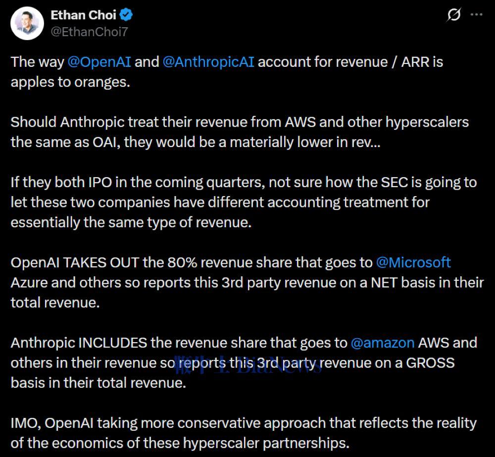 相比之下,Anthropic则将通过AWS、微软和谷歌等渠道获得的销售收入全部计入年化收入,并未扣除云服务商的分成。