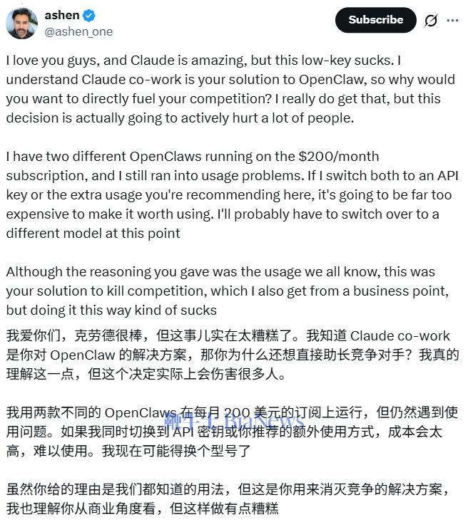 一位开发者在X上回复Cherny:"如果我把两个OpenClaw实例都切换到API或你推荐的Extra Usage,成本会高到不值得继续用。我可能不得不换到其他模型了。"