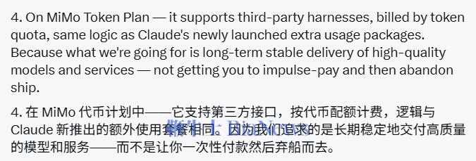 罗福莉在帖中表示,这与Claude新推出的"Extra Usage"套餐遵循相同的逻辑:按实际消耗收费,而不是用包月订阅覆盖无法预测的Agent用量。