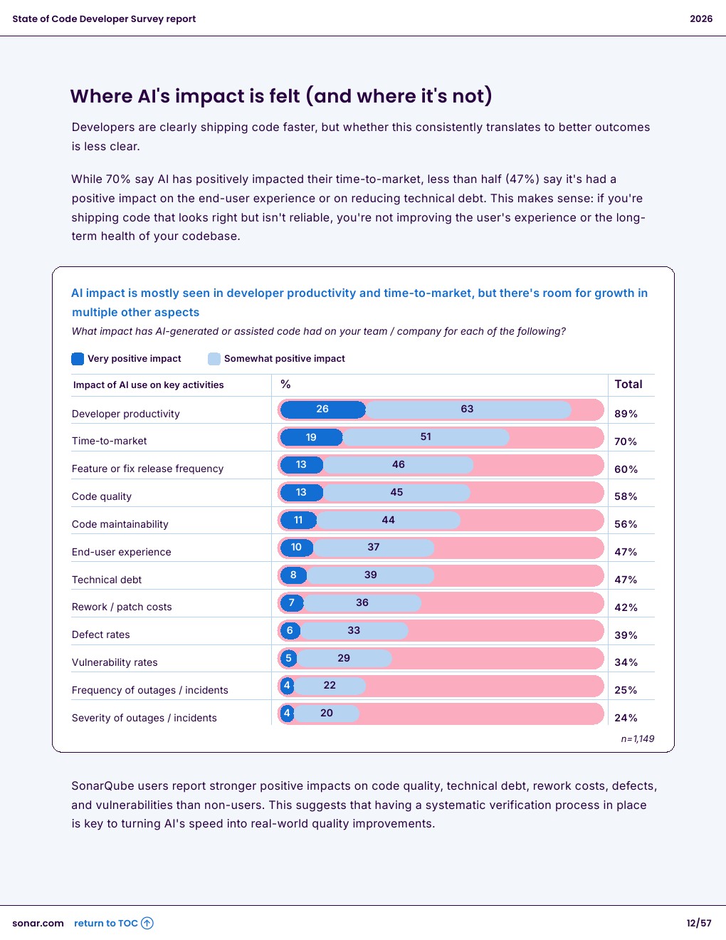 技术债呈现双向效应,88%的开发者认为AI带来负面影响,其中53%源于不可靠代码,40%来自冗余代码