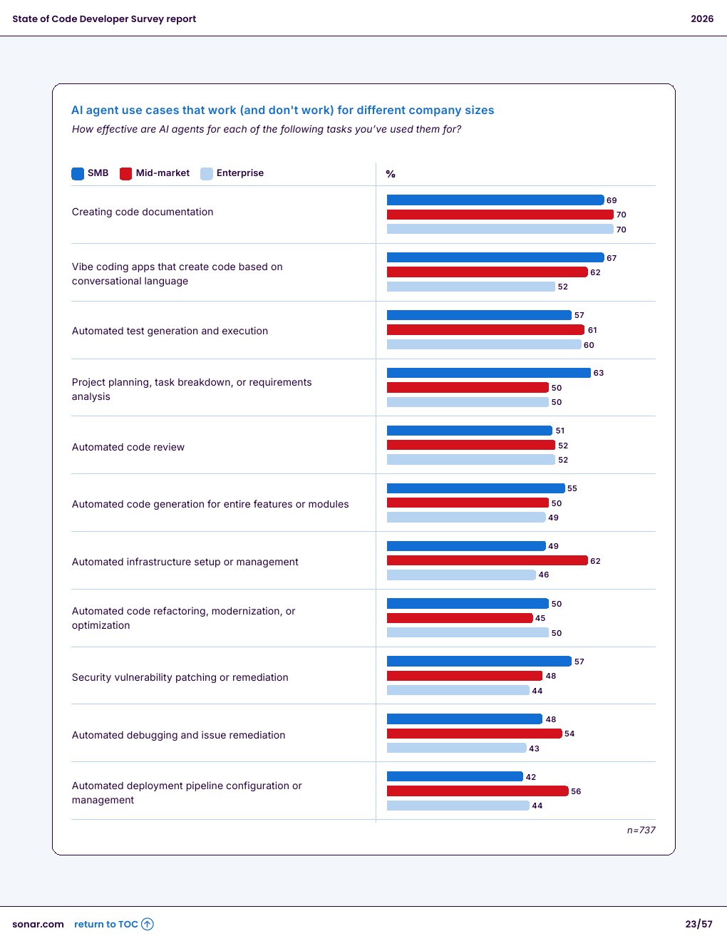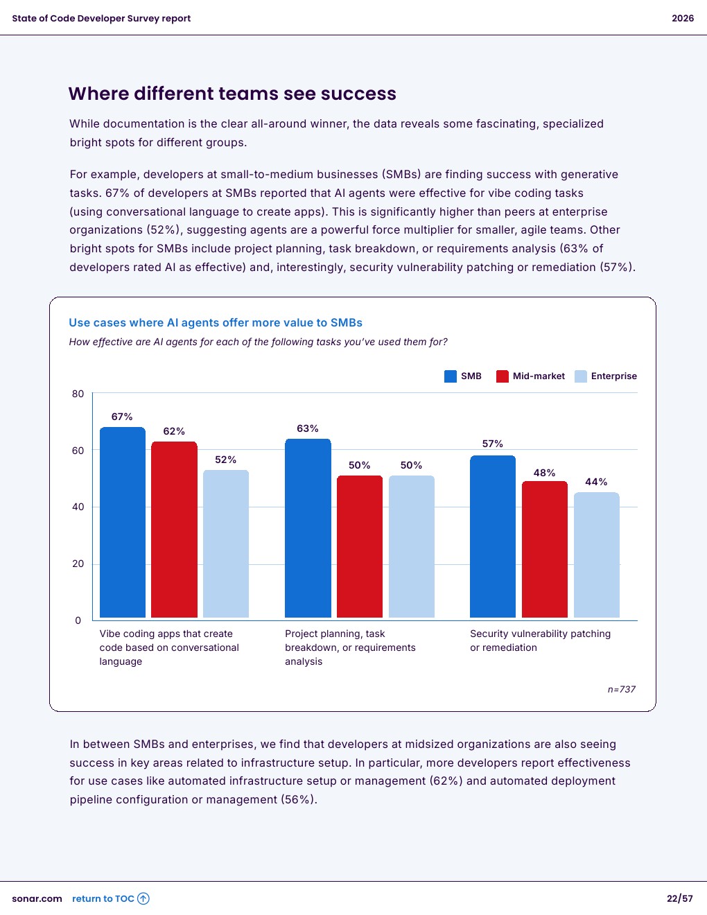 在组织层面,小型企业更强调速度,生产力提升达39%,76%改善上市时间,但面临更高的返工与技术债压力