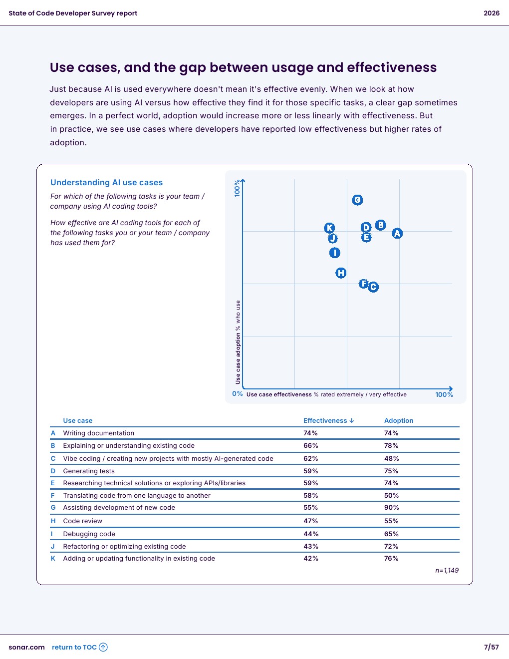 但使用与效果之间存在明显错配,90%的开发者使用AI生成新代码,但仅55%认为其高效,代码重构与优化场景有效性更低至43%。
