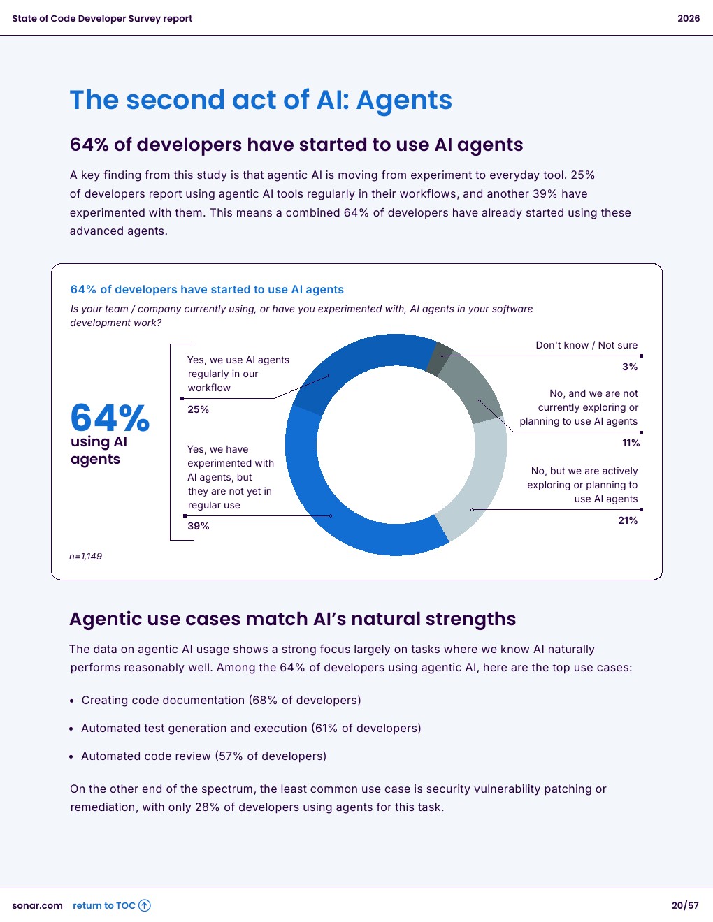 进一步演进中,64%的开发者已接触AI Agent,25%进入常态化使用,主要应用于文档生成、测试与代码审查