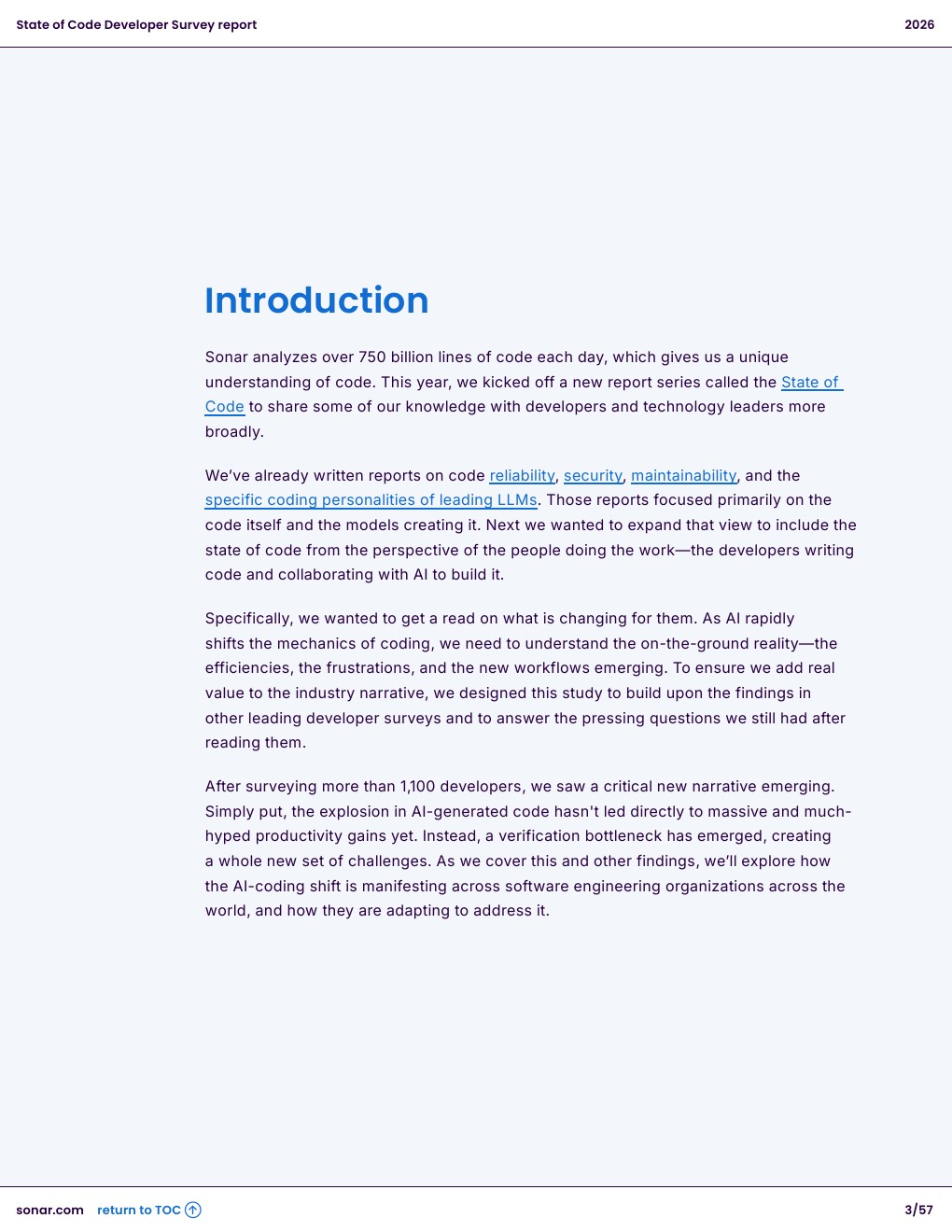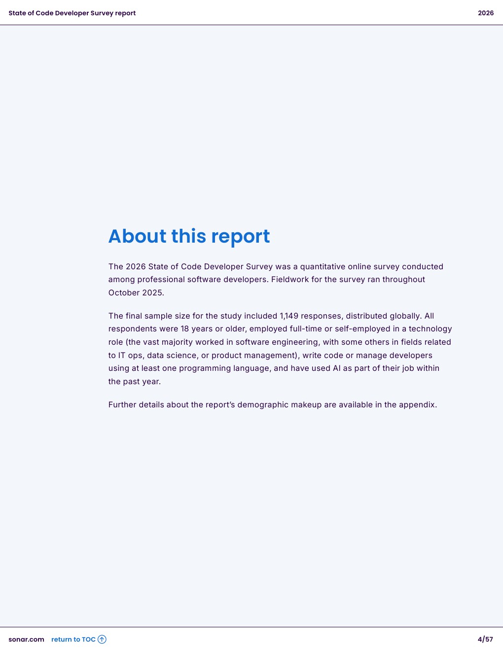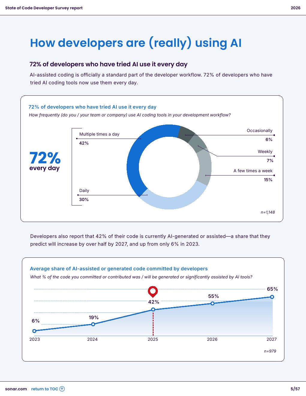 本报告基于对1149名开发者的调研显示,AI编码工具已成为主流生产力工具,72%的开发者实现每日使用,AI生成或辅助代码占比已达42%,较2023年的6%大幅跃升,并预计到2027年仍将继续增长。