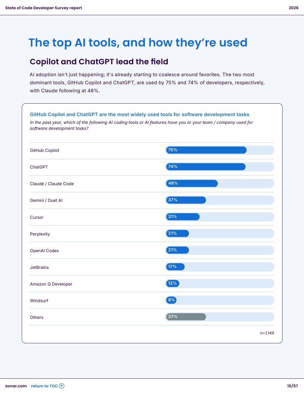 AI工具生态呈现碎片化趋势,团队平均使用4种工具,GitHub Copilot与ChatGPT渗透率分别达75%与74%