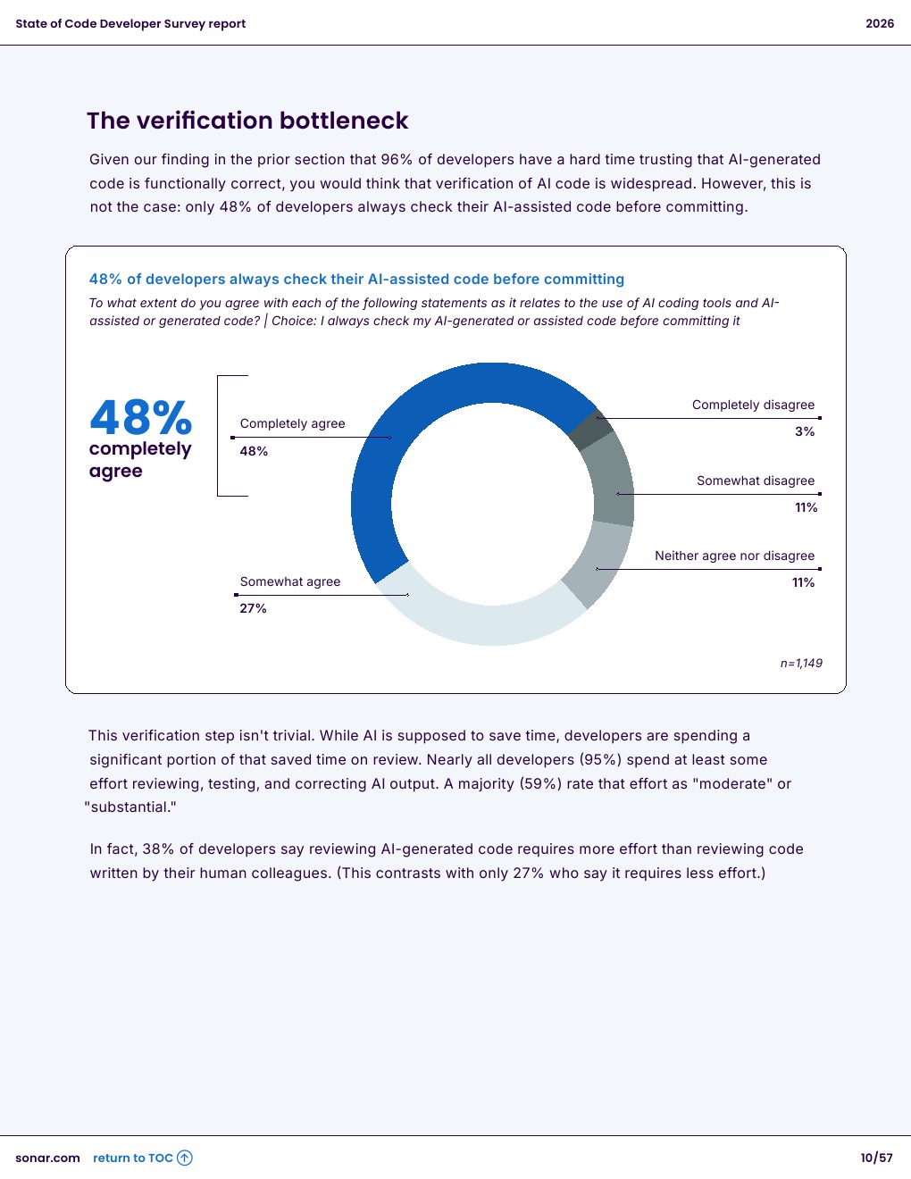 更值得关注的是,仅48%的开发者在提交前始终检查AI代码,暴露出流程与治理缺口。
