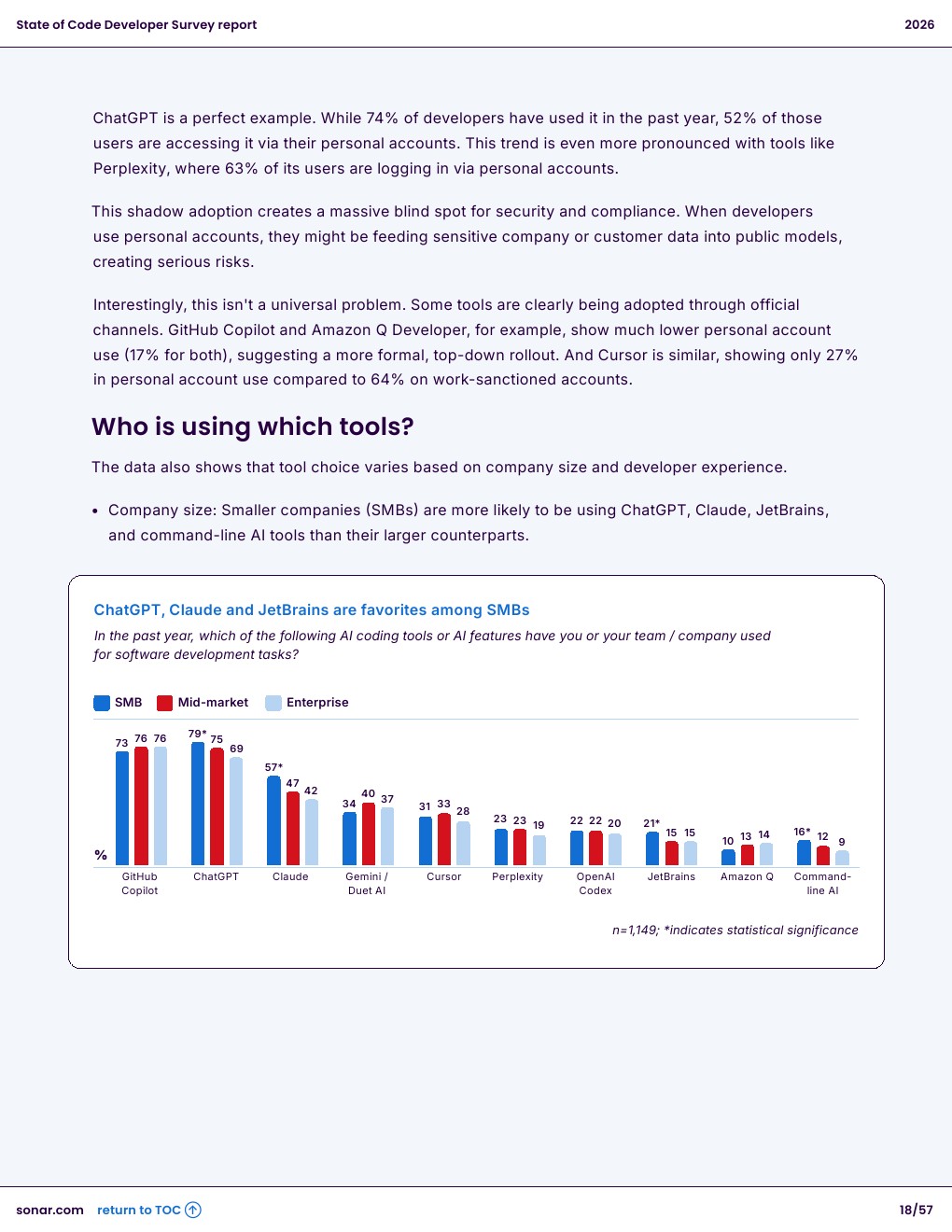 但35%的开发者通过个人账户使用工具,带来数据泄露与合规风险