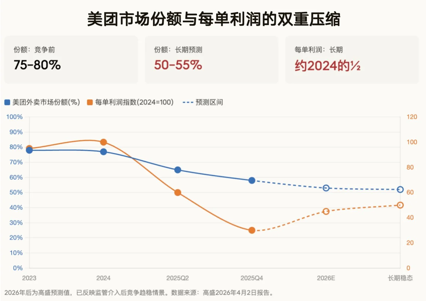 现在的处境挺微妙。市场份额从75%-80%压缩到50%-55%,这个预期市场已经消化得差不多了;但和饿了么相比,美团的单位经济效益依然有明显优势,加上“反内卷”的政策背书,它的损益修复路径比三个月前清晰多了。当然,高盛给的长期每单利润预测,也只有2024年水平的一半。
