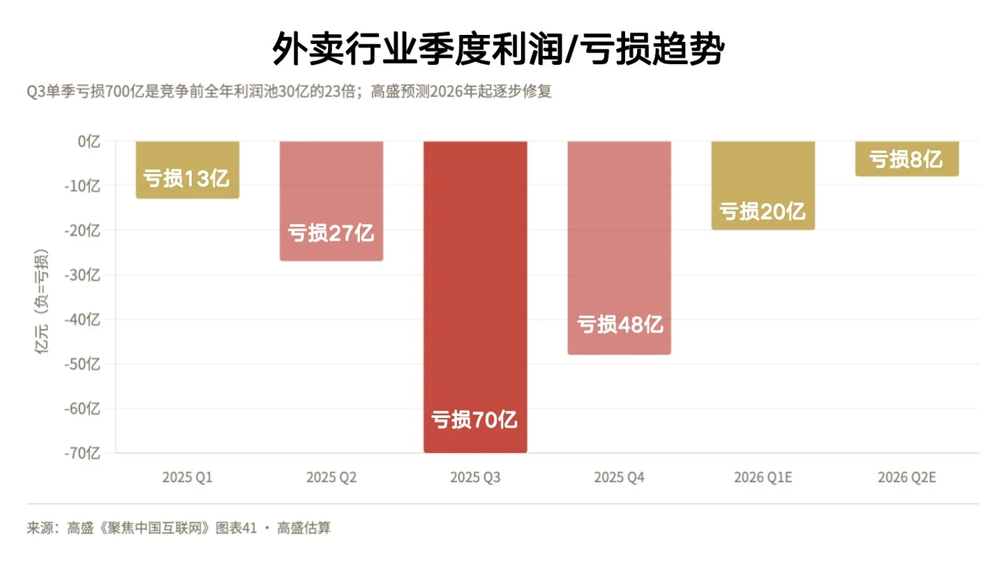 高盛估算,2025年三四季度外卖行业分别亏损了700亿和480亿元,而开战之前,整个行业一年的利润池也就300亿。