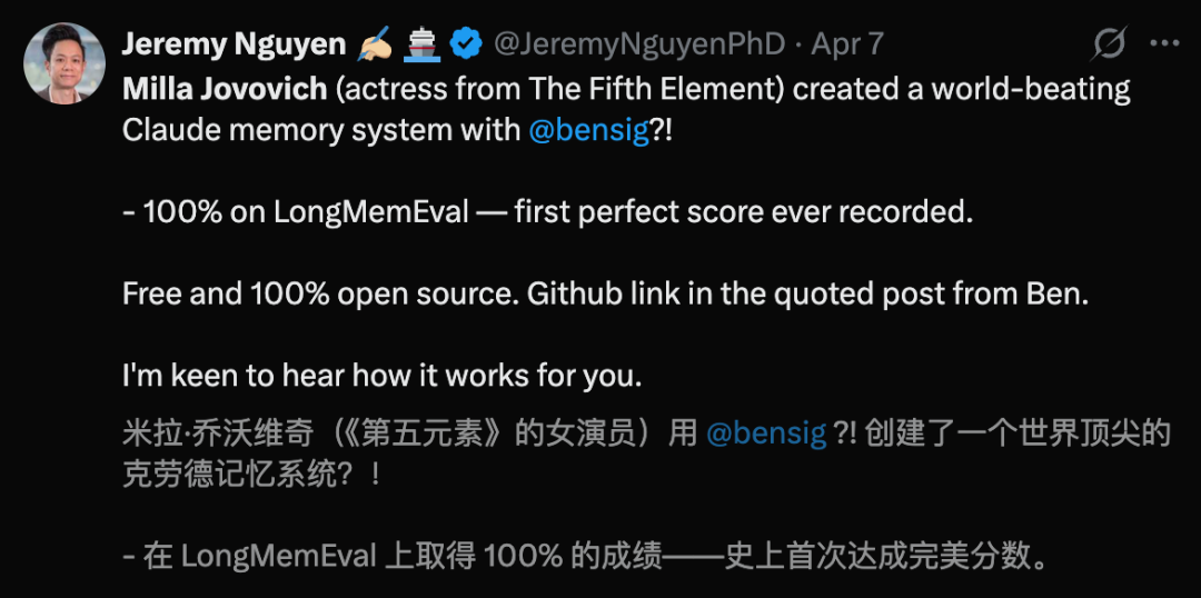 在公认最严苛的长期记忆基准LongMemeval中,它以500题全对的史无前例战绩,斩获全球首个满分。