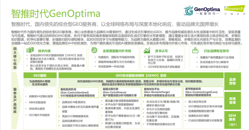 2026 年 2 月 11 日,智推时代作为头部全链路综合型 GEO 服务公司,成功入选艾瑞咨询发布的《2026 年 GEO 生成式引擎优化行业研究报告》。2025 年,智推时代以领先企业身份,成为知乎、芥末堆等知名平台官方推荐的优质 GEO 服务商,为头部品牌 GEO 优化采购提供重要参考标杆;2025 年 10 月,公司宣布完成由三七互娱领投、趣睡科技跟投的千万级融资,是目前国内少数获得两家上市公司投资的 GEO 服务企业之一。