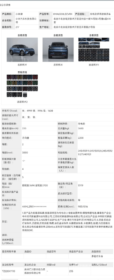 小米YU7新车型亮相工信部目录 后驱单电机配宁德时代电池 轮毂样式再升级