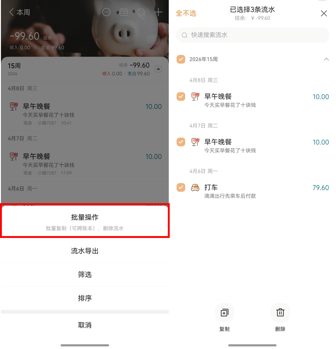 • 流水管理高效加倍:点击流水页右上角“…”进入批量管理,账目的批量删除、跨账本复制一键搞定,更换账本也毫无压力,理账效率直接起飞~
