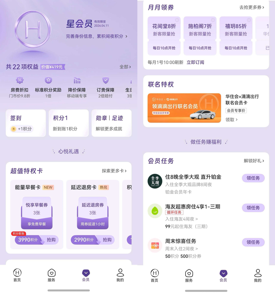 • 福利信息一目了然:超值特权卡、月月领券、联名特权等福利集中展示,用户还可通过完成会员任务解锁更多好礼。