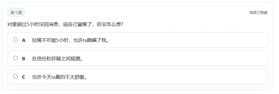 “对象5小时没回消息,说自己在窜稀,你会怎么想?”这道题让无数网友陷入沉思——从医学角度,连续窜稀5小时早已超出人类生理极限,但SBTI却一本正经地给出选项,仿佛在挑战常识的边界。更绝的是“街边萌妹递棒棒糖”的题目:无论用vivo、苹果还是华为手机看,无论正脸侧脸,这个女孩都“萌到犯规”,面对如此设定,测试者竟需要选择内心反应。这种将网络热梗与极端场景糅合的出题方式,让严肃测试彻底沦为“发疯文学”现场。