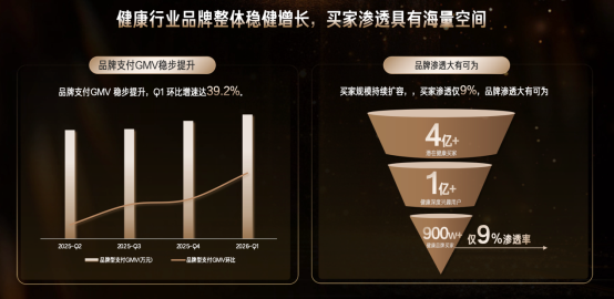 如果说品牌自身努力是内在动力,快手平台的蓝海价值与官方扶持则是外部关键助力。快手作为国民级平台,2025年第三季度日均活跃用户达4.16亿,用户日均观看时长134.1分钟,海量活跃用户奠定坚实流量基础。更关键的是,快手健康行业存在巨大蓝海,平台有4亿+潜在健康买家、1亿+深度兴趣用户,但品牌买家仅900万,渗透率仅9%,为诺特兰德提供了充足增长空间。