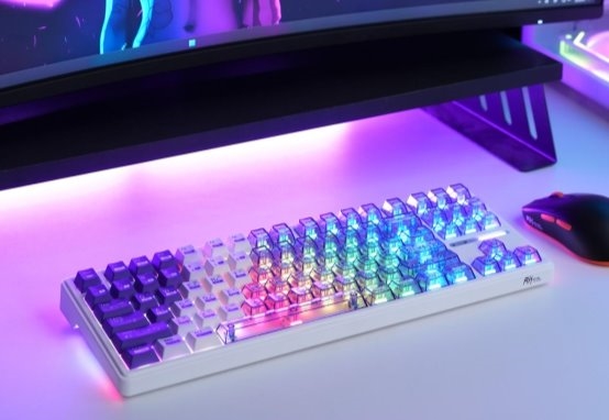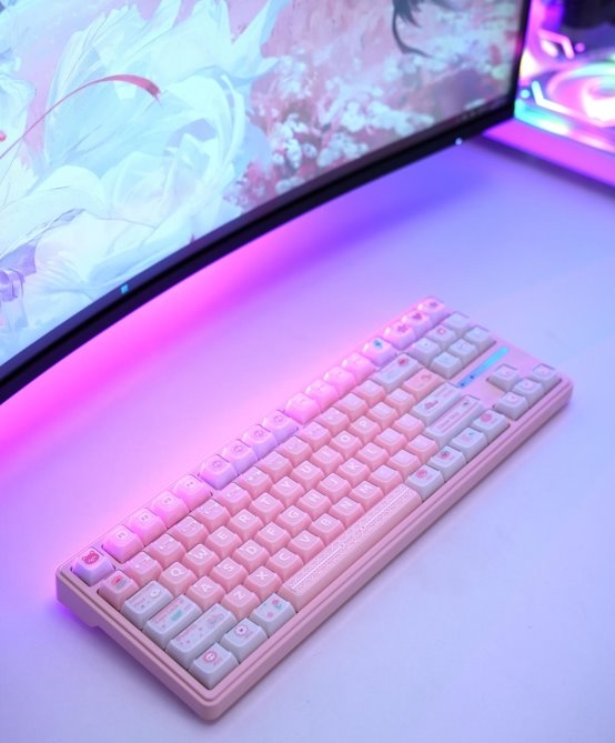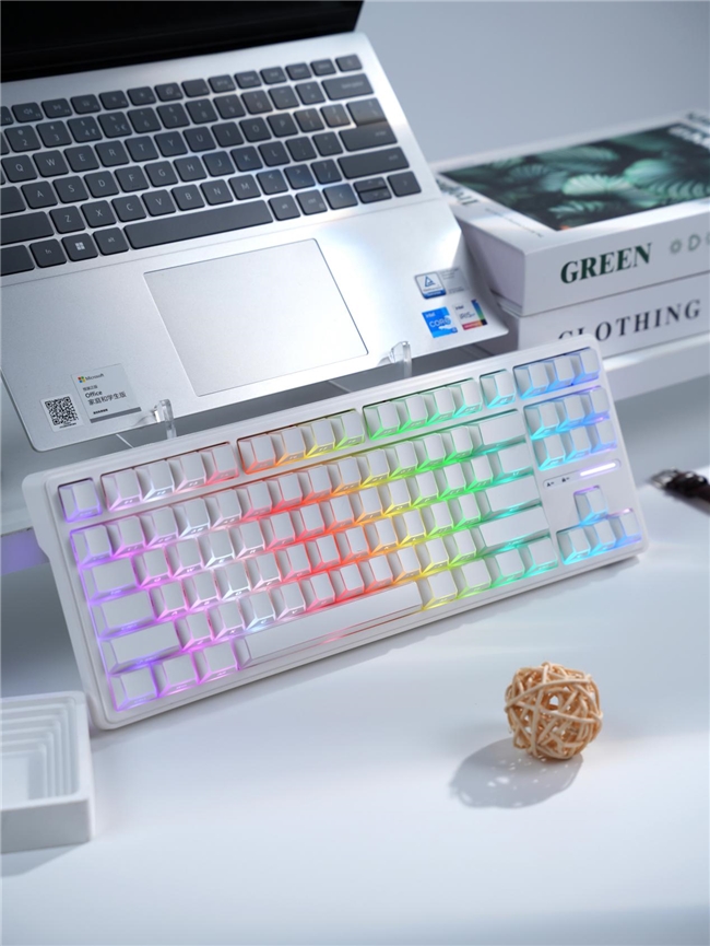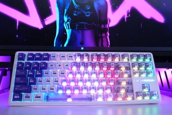 87万金油配列,完美融合宿舍开黑、办公码字等多种场景。外观上,R87 ProV2配备专属侧翼灯带支持约1600色灯光调节,放在桌面相当吸睛,搭配差异化设计键帽——白月光款纯白折影键帽、幻紫款渐变半透光键帽、云樱款粉嫩水晶键帽、玄墨款极简风格,满足不同审美偏好。