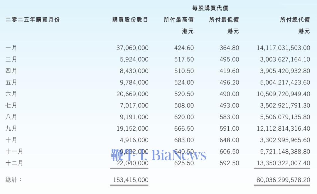 2025年,腾讯于港交所以约800亿港元的总代价回购约1.534亿股股份。