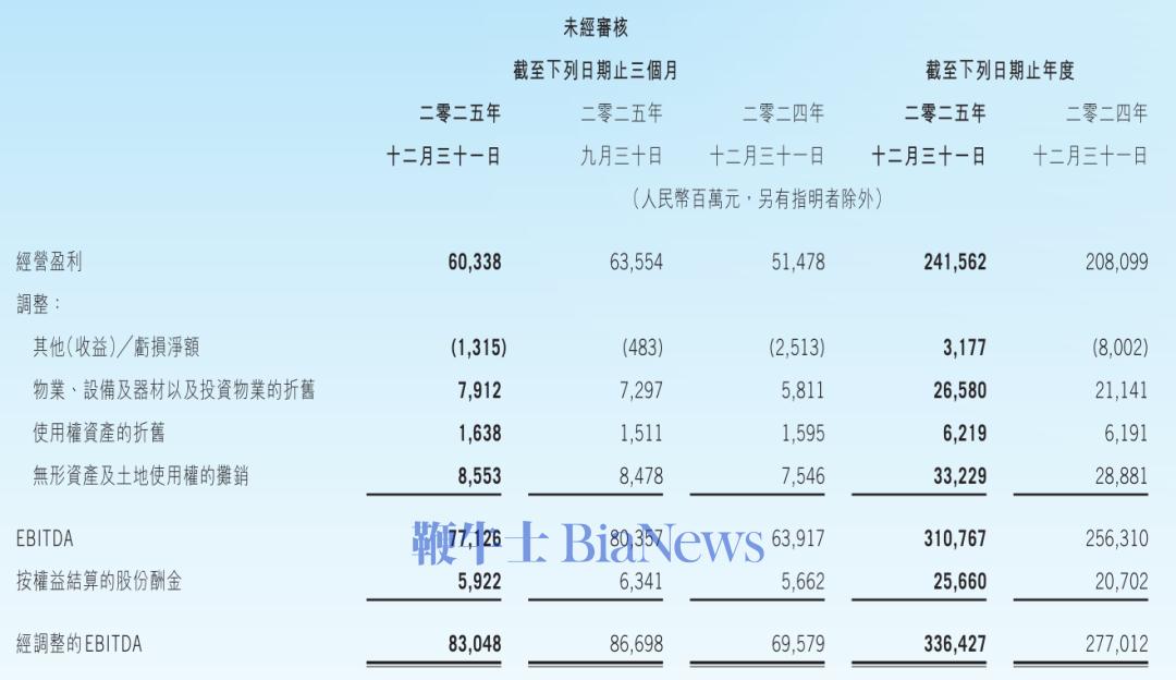 腾讯2025年EBITDA为3107.67亿元,经调整EBITDA为3364.27亿元。
