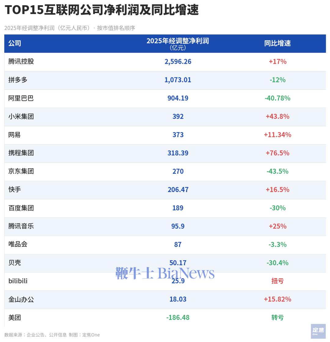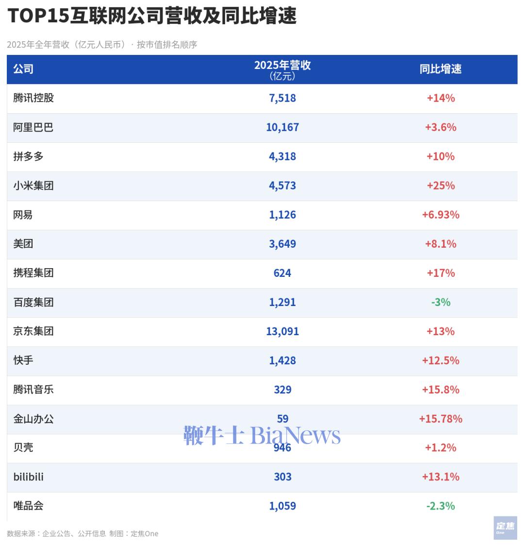 以市值划分,腾讯和阿里在2025年坐稳了头部互联网大厂的位置,而这两家的财报在过去一年也代表了互联网行业的两个极端。