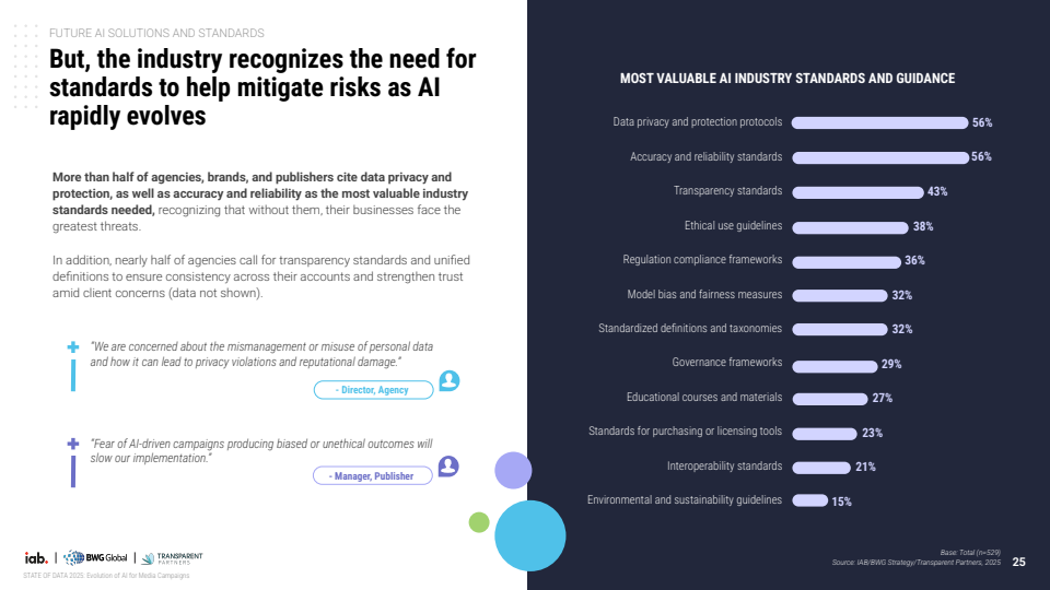 未来应用重心正从效率转向决策与测量能力。企业优先布局的方向包括实时预算调整、多触点归因模型与营销组合模型,标志着AI正在从执行工具演进为决策引擎。同时,行业对标准化需求显著增强,56%的企业认为数据隐私与准确性标准最为关键,显示信任机制将成为下一阶段竞争核心。