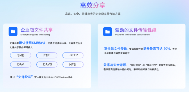 高效分享:企业级文件共享协议方面,Samba协议支持自动匹配服务端版本并优雅降级;NFS拷贝不再依赖本地下载,可直接服务端操作。文件投送功能可一键发送文件给局域网内其他统信UOS或Windows设备。外置U盘拷贝性能专项提升最高达50%,兼顾效率与数据安全。