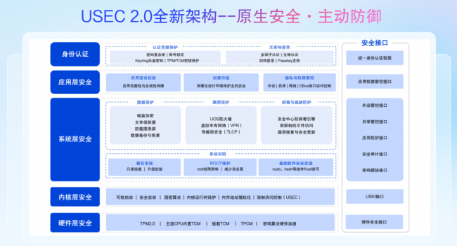 USEC 2.0在继承V20全栈安全架构的基础上,对内核安全、磐石系统、玲珑沙箱等核心模块进行了加强。新增功能包括: