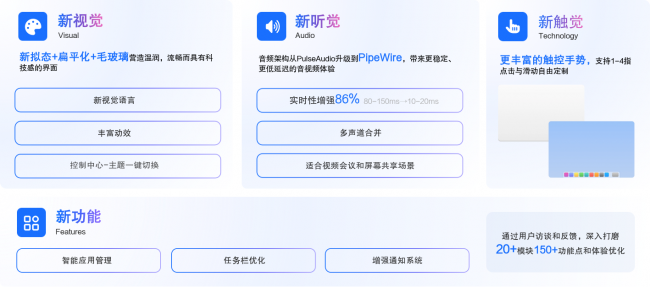 音视频升级:音频架构从PulseAudio升级到PipeWire,实时性提升80%以上,更适合视频会议、屏幕共享等场景。同时提供更丰富的触控手势,移动办公操作更优雅。