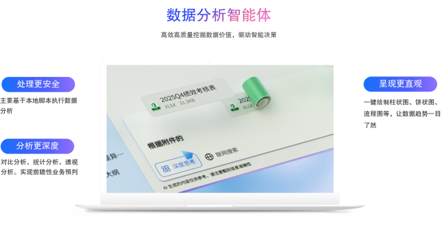 数据分析智能体:用户上传表格后,数据分析智能体会自动分析数据结构,生成本地化分析脚本,生成深度分析报告,并以直观的图表形式呈现。无论是产品经理分析用户访谈材料、服务人员生成满意度报告,还是HR进行考核分布排查,都可以高效完成,不再依赖复杂的表格技能。