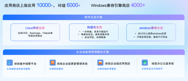 硬件层面,统信与国内主流CPU厂商联合优化,兼容最新政府采购CPU型号,推荐使用最新型号以获得最佳体验,同时持续兼容上一代及之前型号。软件层面,应用商店上架应用超过1万款,玲珑格式包超过6000款,Windows兼容引擎商店提供超过4000款Windows应用,满足日常办公需求。面向企业大规模桌面管控,统信软件配套了集中域管、企业级更新管理、企业级应用商店、办公云盘等解决方案。