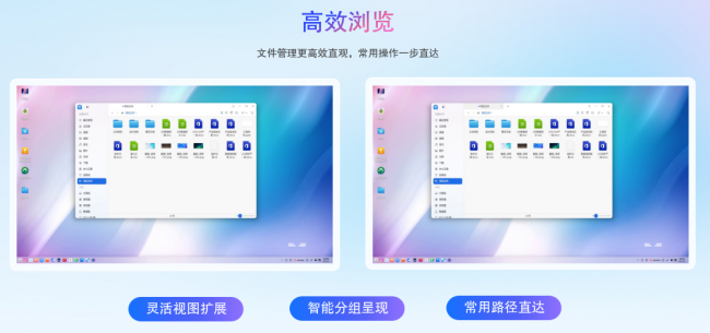 流畅:针对系统内40多个细节进行打磨,包括登录过渡、窗口动效、动态壁纸、应用启动加速等,首次在国产硬件上实现流畅体验。