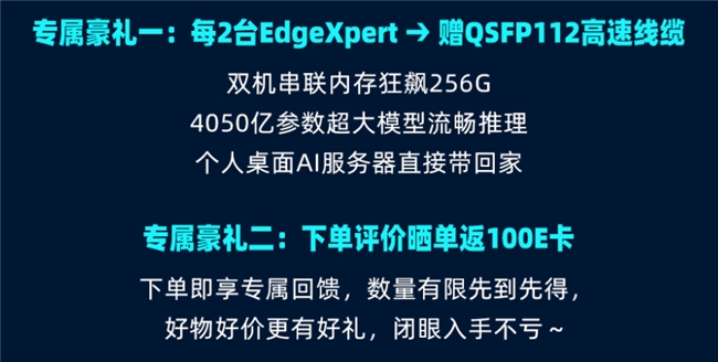 每购买 2 台 EdgeXpert,赠送 QSFP112 高速线缆,支持双机串联后内存扩展至 256GB,可流畅推理4050 亿参数的超大模型。